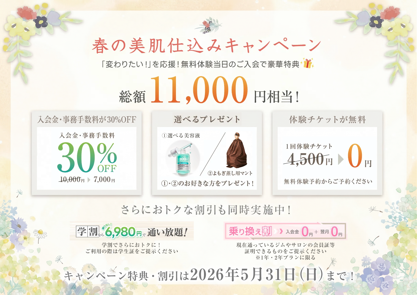 今注目のよもぎ蒸しが何度でもお楽しみ頂けます。体の芯(内臓器官)を温め、発汗することで代謝アップや体内に溜まった老廃物、毒素の排出を促します。
